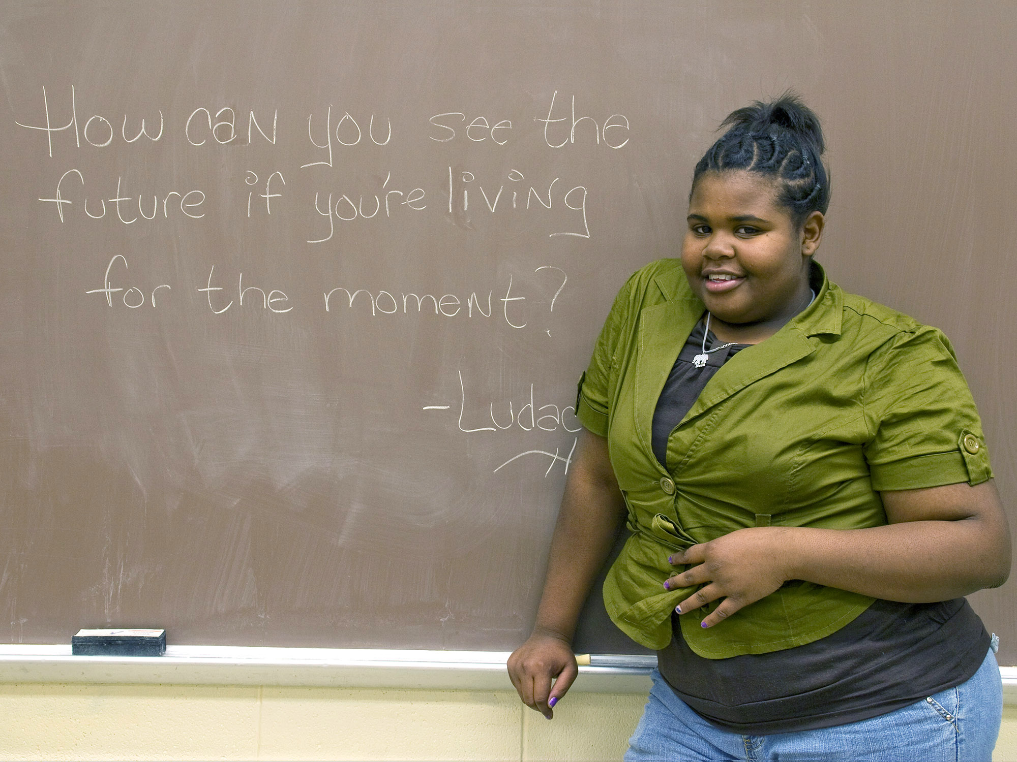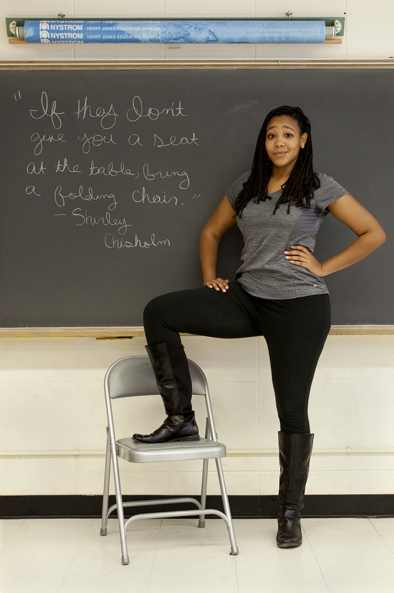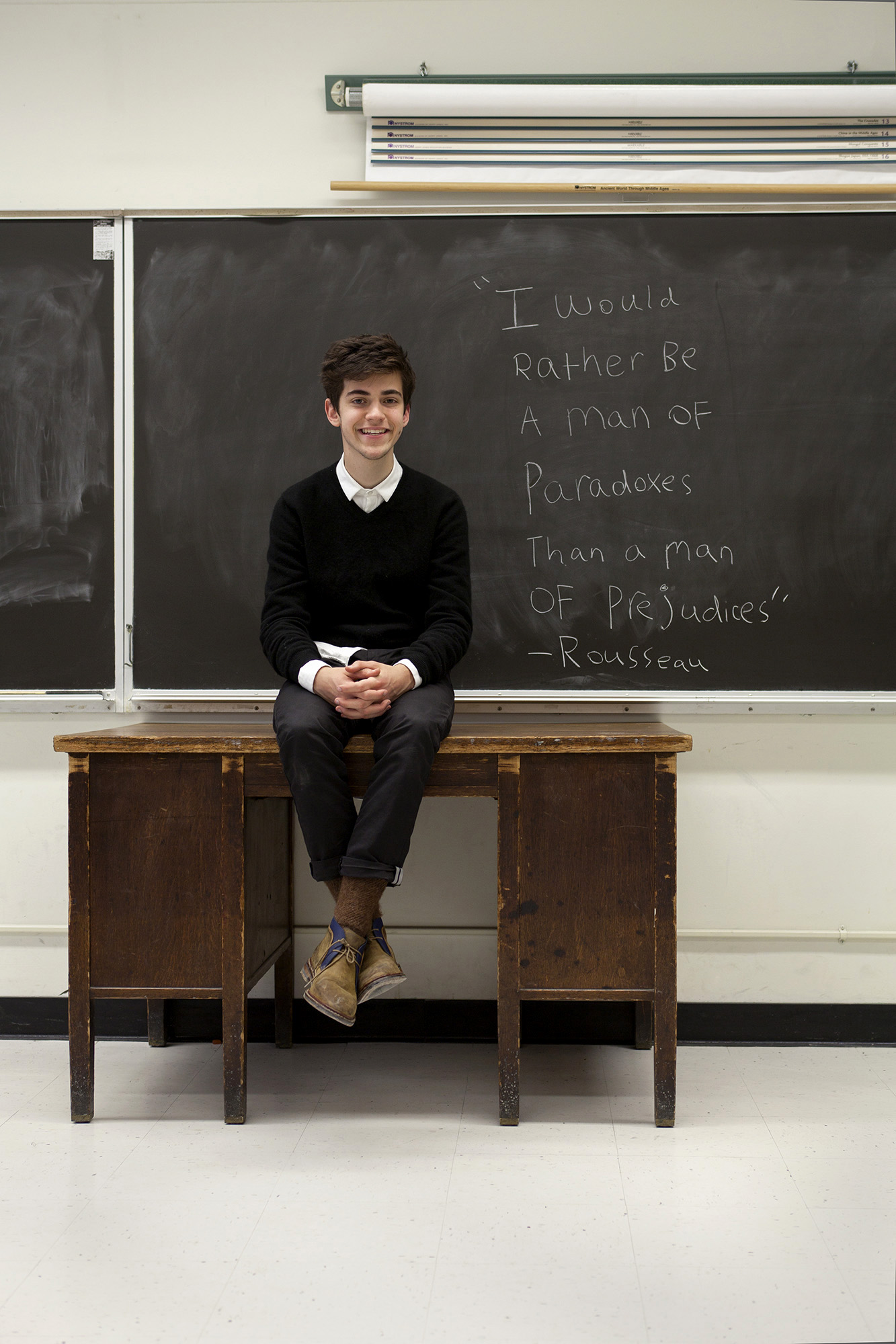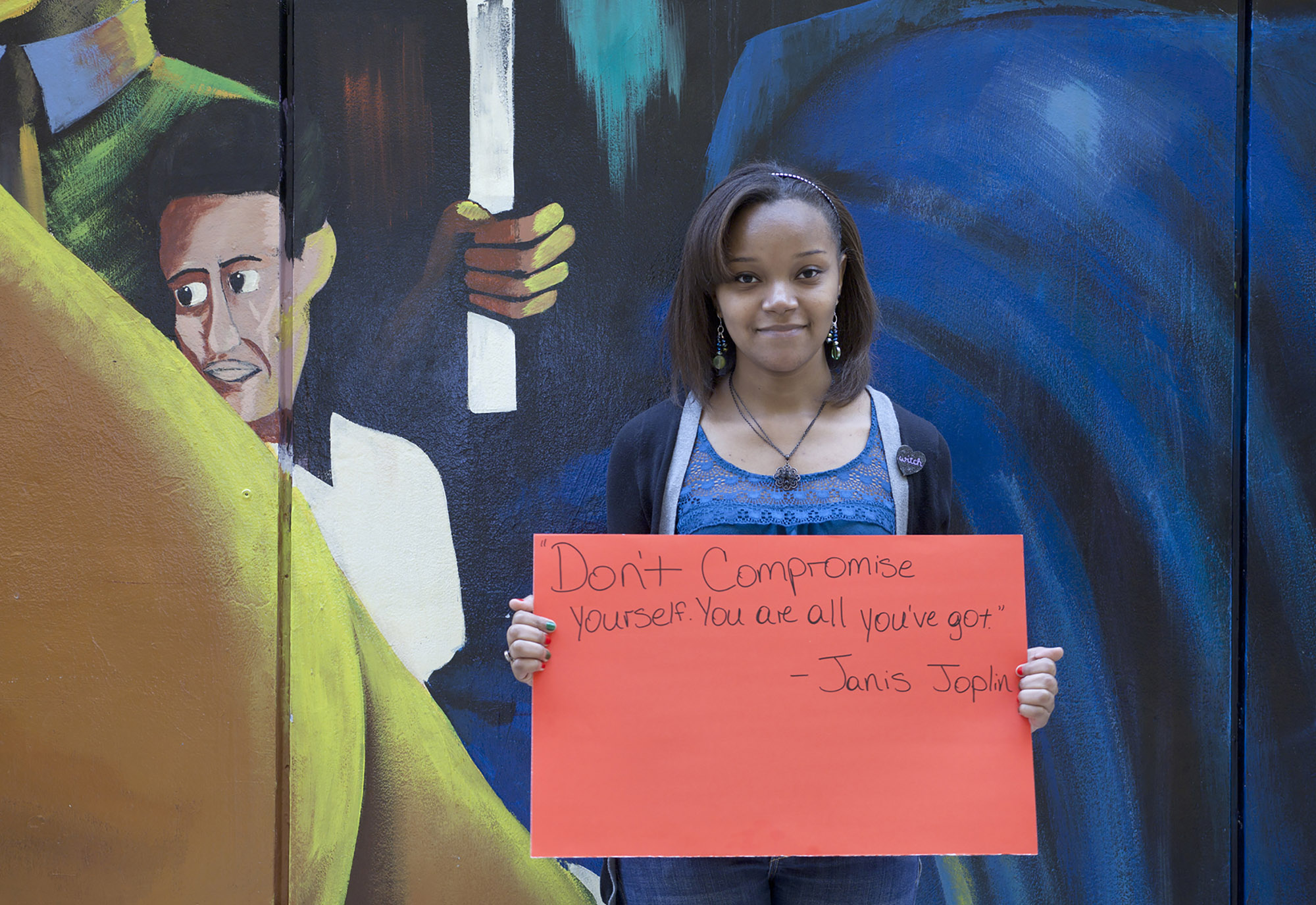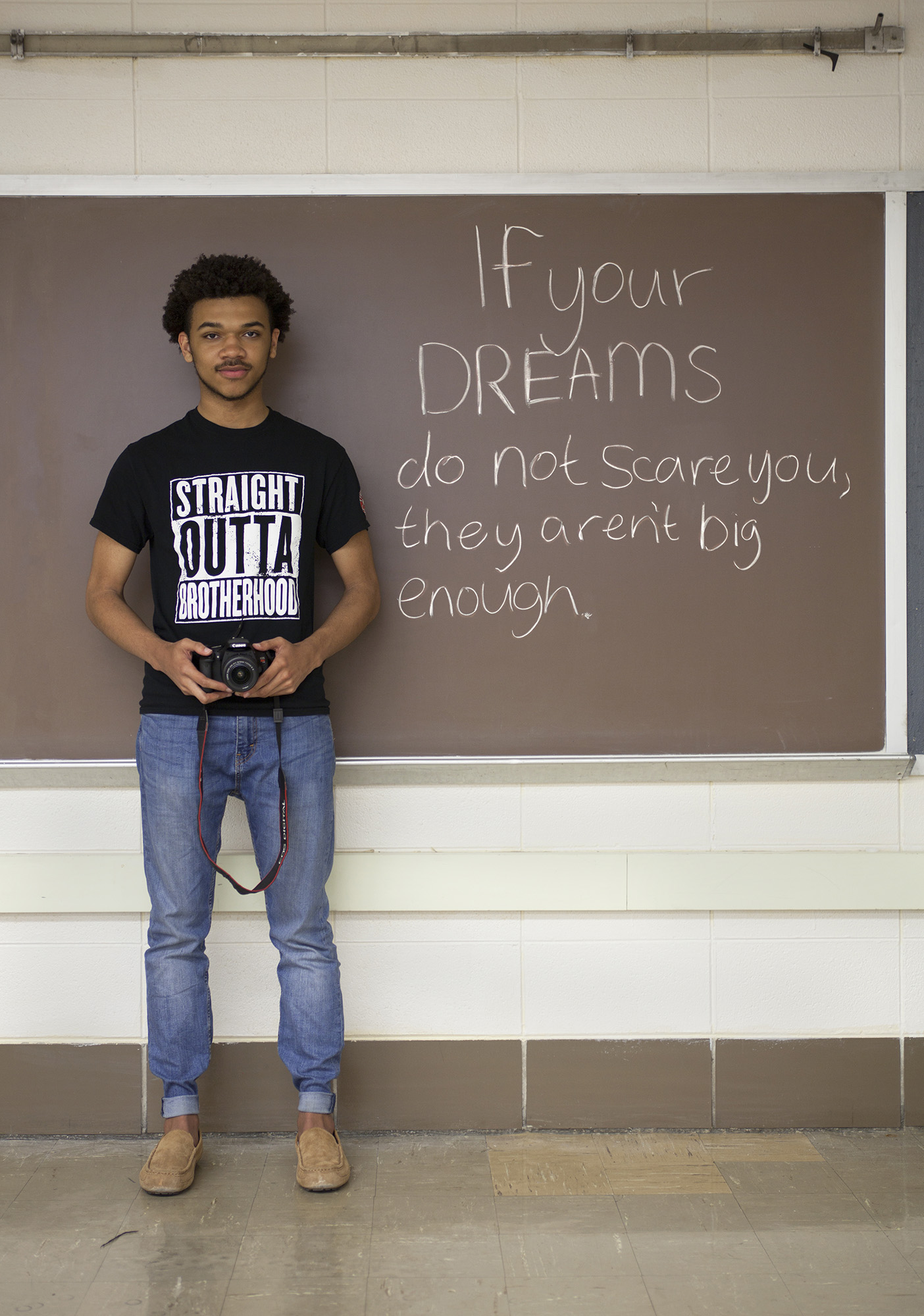 The High School Photo Project started in 2008 as Barack Obama was running for President. The students are seniors at the three high schools in the Obama’s home community of Hyde Park-Kenwood on Chicago’s southside. The students are asked to bring a quotation they believe speaks of their identity, interests, or beliefs. They wear what they wish and are welcome to bring props. They pose themselves and write the words they’ve chosen on a chalkboard in their school.