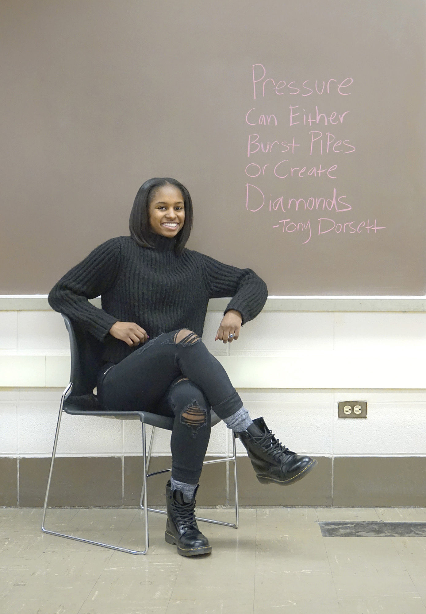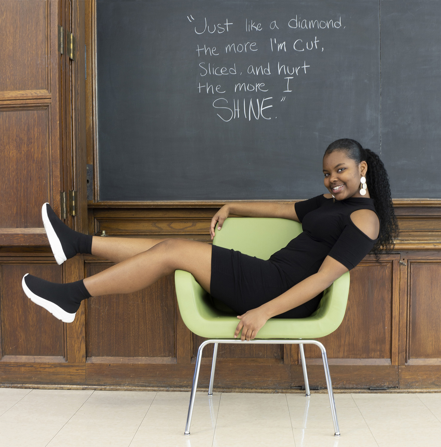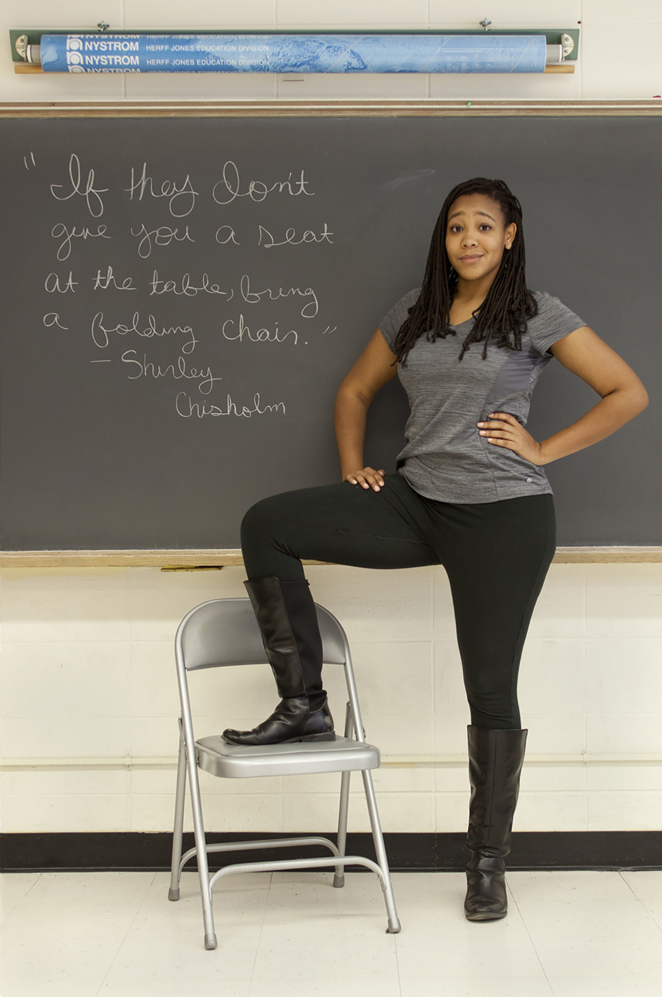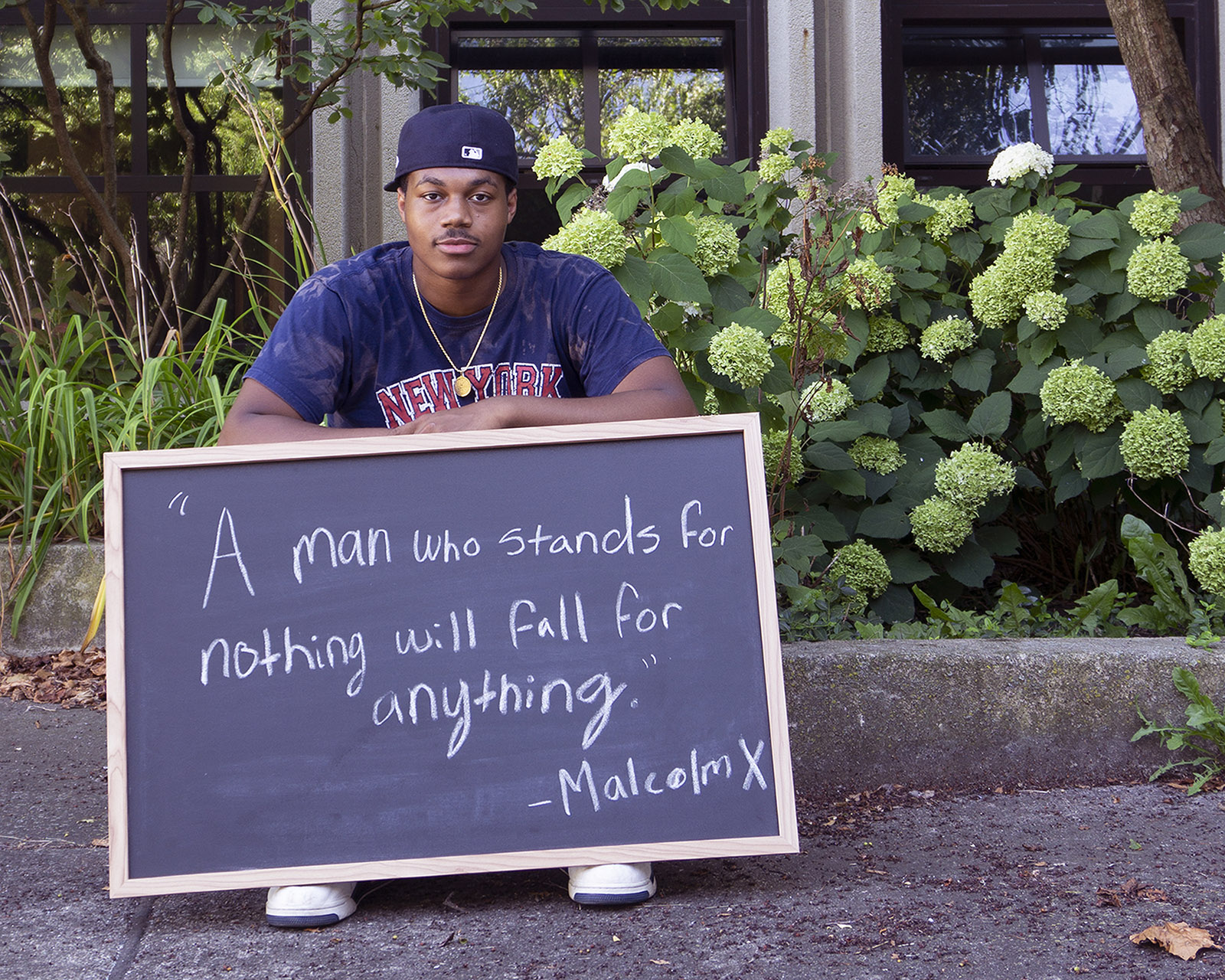 The High School Photo Project started in 2008 as Barack Obama was running for President. The students are seniors at the three high schools in the Obama’s home community of Hyde Park-Kenwood on Chicago’s southside. The students are asked to bring a quotation they believe speaks of their identity, interests, or beliefs. They wear what they wish and are welcome to bring props. They pose themselves and write the words they’ve chosen on a chalkboard in their school.